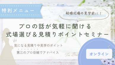 EVENT 式場選びをスタートする前に受けたい!式場選び&見積りポイントセミナー 【2026年4月4日更新】結婚式場選びのポイントが見えてくる!パートナーと気軽に参加できるブライダル相談セミナー「結婚式を考え始めたけど、何から検討したらいいの?」「特にやりたいことも、こだわりもない... 2025.11.01 EVENT