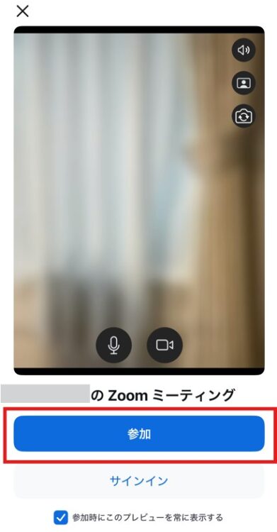 カメラマークとマイクマークに斜線が入ってないか確認して「参加」をタップ。