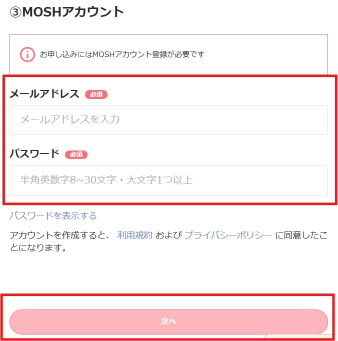 3. MOSHの会員登録(無料)を入力して次へ